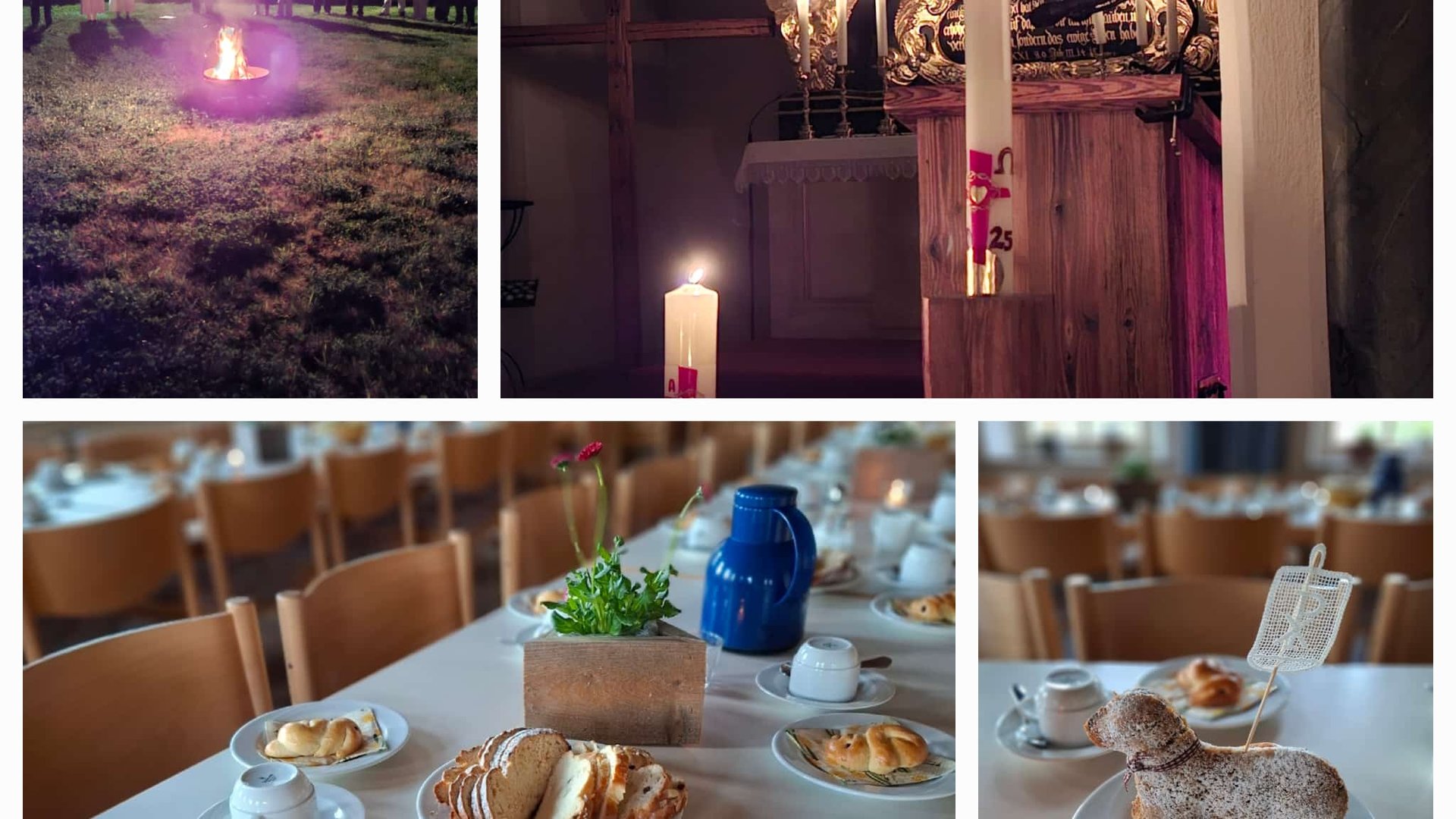 Mit Schweigezeiten und liturgischen Elementen, Gebetszeiten, Austausch, gemeinsamen Mahlzeiten, Sedermahl, Nachtgebet, Kreuzweg, Liturgie zur Sterbestunde, Osternacht, Osterwanderung.
