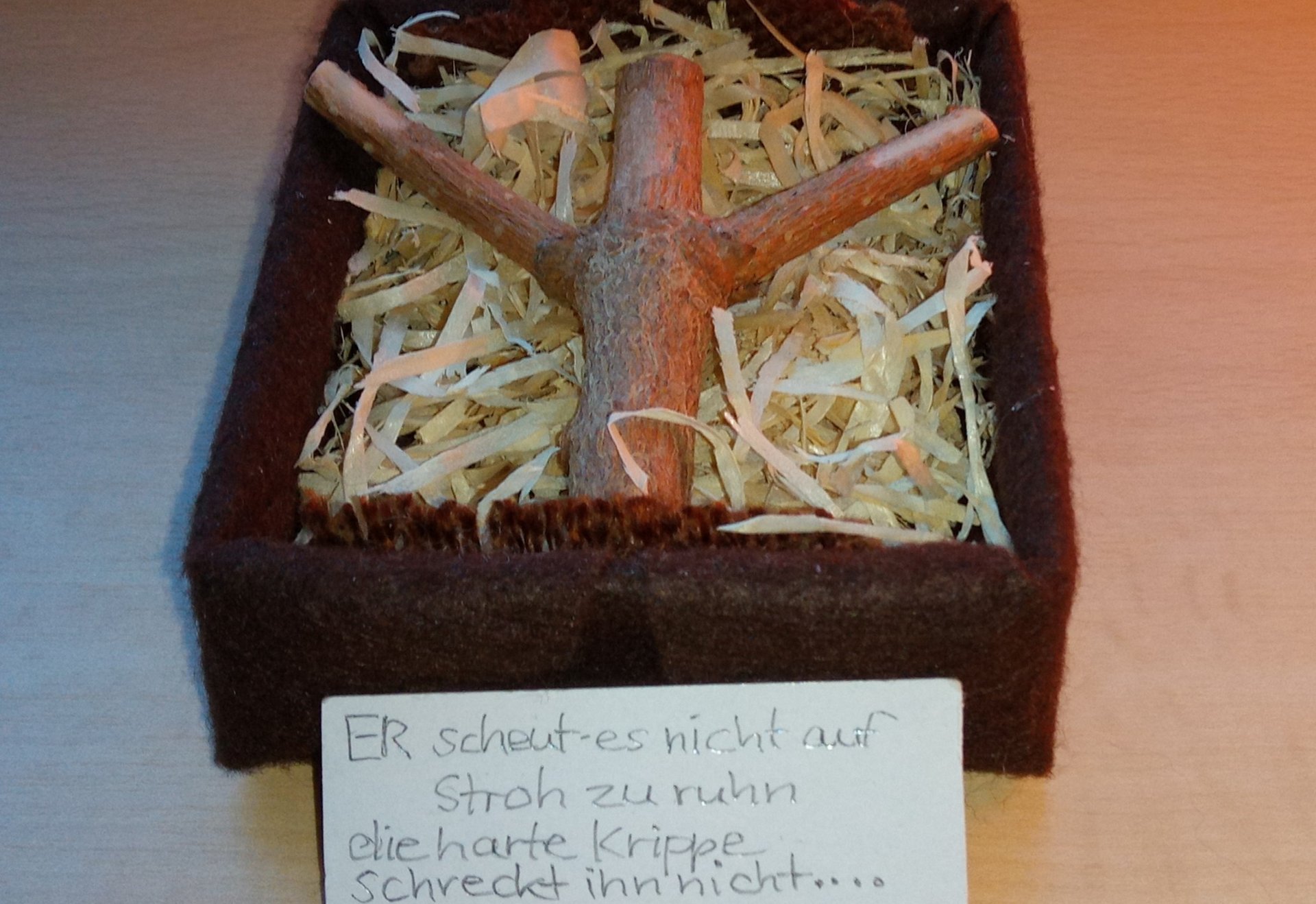 Mich berührt diese kleine schlichte Krippe. Nicht nur, weil ich spüre, mit wie viel Liebe sie gemacht ist. Sondern auch, weil das Holzast-Kind mit weit geöffneten Armen daliegt. Es erinnert mich immer auch bereits an den Gekreuzigten. So kommt Gott zu uns. Als schutzloses Kind, das später durch die tiefste Dunkelheit gehen muss. So wird ER einer von uns, kommt hinein in die Zerbrechlichkeit unseres Menschseins. Wird unser Bruder in allem, was unser Leben umfasst. Das ist mir Trost, Hoffnung und auch Freude.