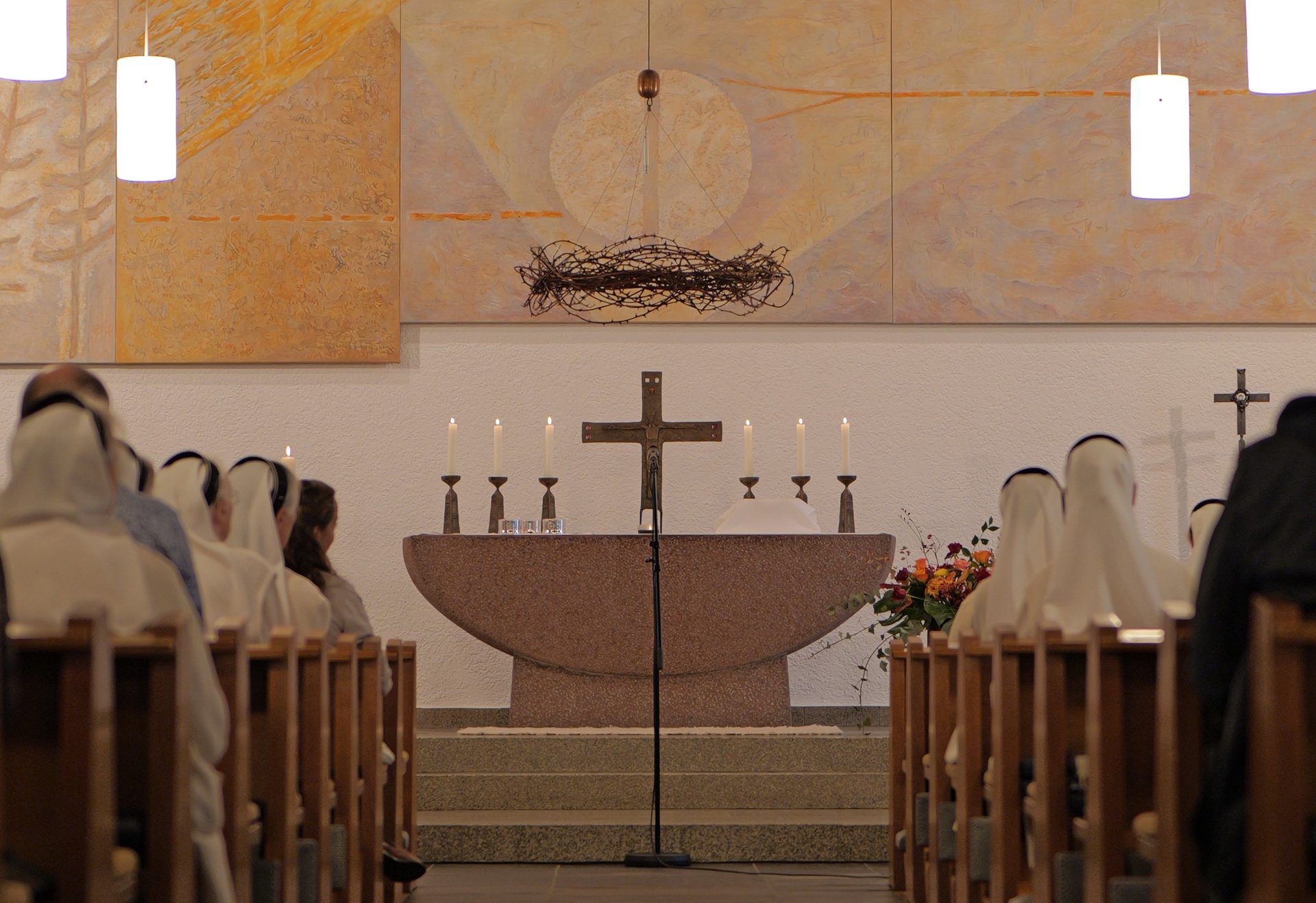 Ich sitze in unserer Ordenshauskapelle und versenke mich in das Altarbild. Der Strom, wiegend in kleinen Wellenbewegungen, nimmt mich mit. Ich bin mitten in dem, was kommt. Gehe mit dem Bild in die Unendlichkeit.Da höre ich von fern eine Stimme, die spricht: „Siehe, ich mache alles neu.“ Ein Wort aus alter Zeit, das mich jetzt erreicht. Vom Thron Gottes her gesprochen, verhallt es nicht. Die Stimme verbindet Vergangenheit und Gegenwart mit der Zukunft. Es ist, als ob für einen kleinen Moment ein Vorhang aufgeht: „Siehe!“
