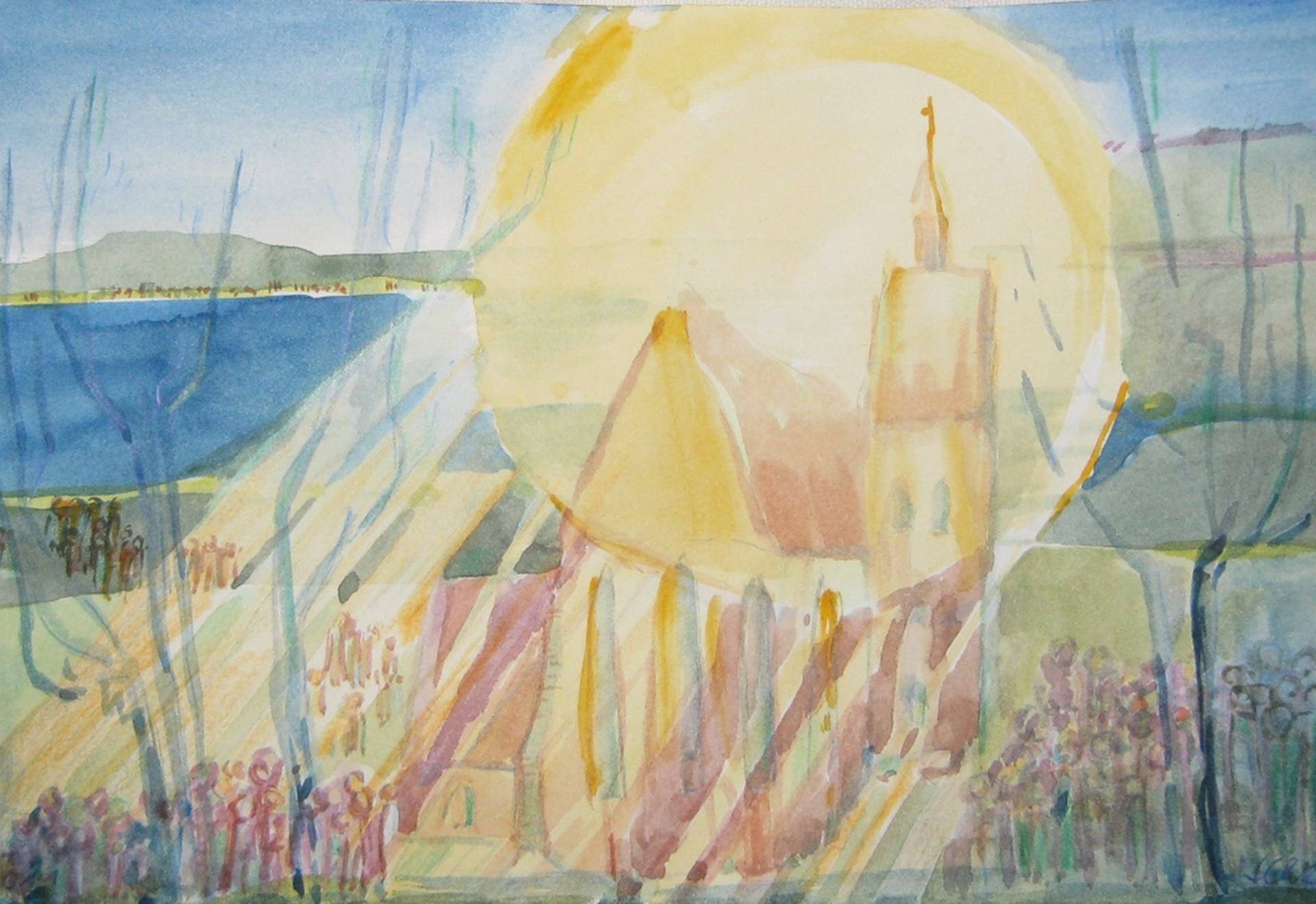 Es ist über 10 Jahre her, dass ich die Kirche am See mit dem großen Licht malte und zu Weihnachten verschickte. Heute lade ich ein, das große Licht mit dem Herzen zu sehen über der eigenen Kirche, der eigenen Gemeinde, den eigenen Beziehungen, dem eigenen Land, der ganzen Erde.